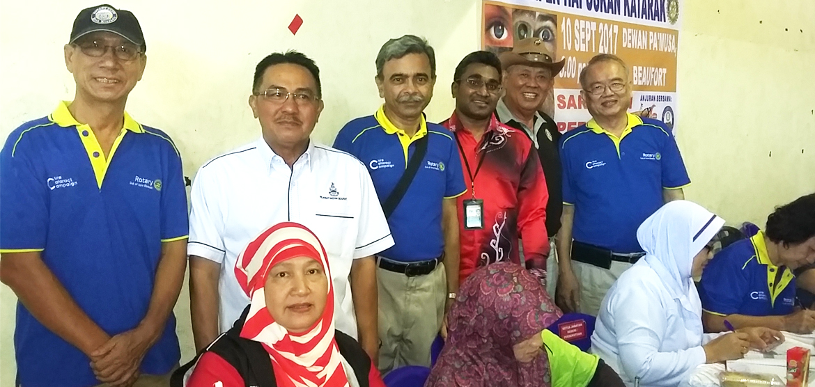 The First Cataract Camp in Beaufort District was held on Sunday, 10 Sep 2017 at Dewan Pak Musa, Beaufort. The camp was jointly organized by Rotary Club of Kota Kinabalu and Hospital Beaufort. Team of Rotarians led by Chairman Paul Thien and President Ravi and consisting of PP Robert Lai, Rotarians Alvin Chong, Rotarians Benjamin Lo, PP Tony Siaw and PP George Ng as well as spouses Jacinta, Margaret and Jenny went to Beaufort to organize the Camp. Beaufort Hospital Director Dr. Sutharsan Kannan and Optometrist Ruby Wong with support staff provided local support. Based on registration 362 patients were screened, 131 were initially referred for further investigation and 97 confirmed to have cataract of varying severity. This is the first Cataract Camp to be funded by the Rotary Global Grant 1642940 and all the patients will get sponsorship of intra-ocular lenses.