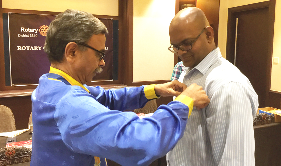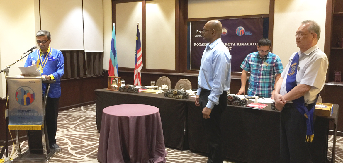Rotary Club of Kota Kinabalu inducted a new member Dr. Bharathan Thevarajah on Monday, 18th September, 2017. Dr. Bharathan is a physician and nephrologist and works as a consultant in the KPJ Sabah Specialist Hospital. He was introduced to Rotary by President Dr Ravi Mandalam, who also works in the same hospital as Consultant Radiologist. Chairman of Membership Committee PP Patrick Chin announced the classification of the new member. President Ravi read the charge of induction, pinned the membership badge and presented the new member the certificate of membership. Members welcomed Dr Bharathan into our Club.