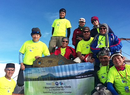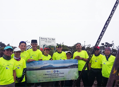The Rotary Club of Kota Kinabalu organized the Three Mountain Charity Climb to raise funds to aid poor cataract patients that require surgery. The team led by President Dr Ravi Mandalam consisted of Rotarians, doctors, nurse, NGO activist and park rangers.